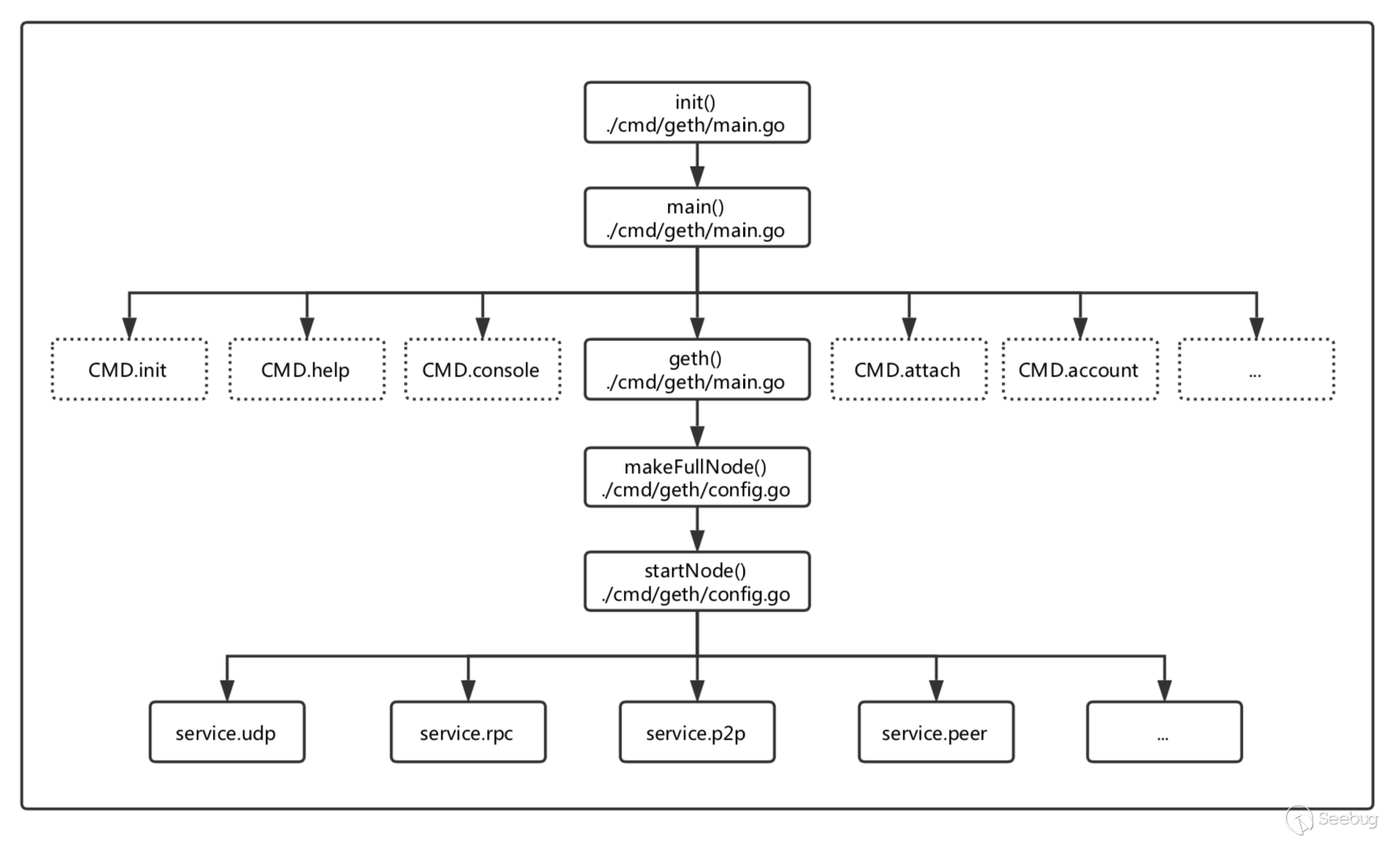 无论是通过 geth() 函数还是其他的命令行参数启动节点,节点的启动流程大致都是相同的,这里以 geth() 为例/cmd/geth/main.go
